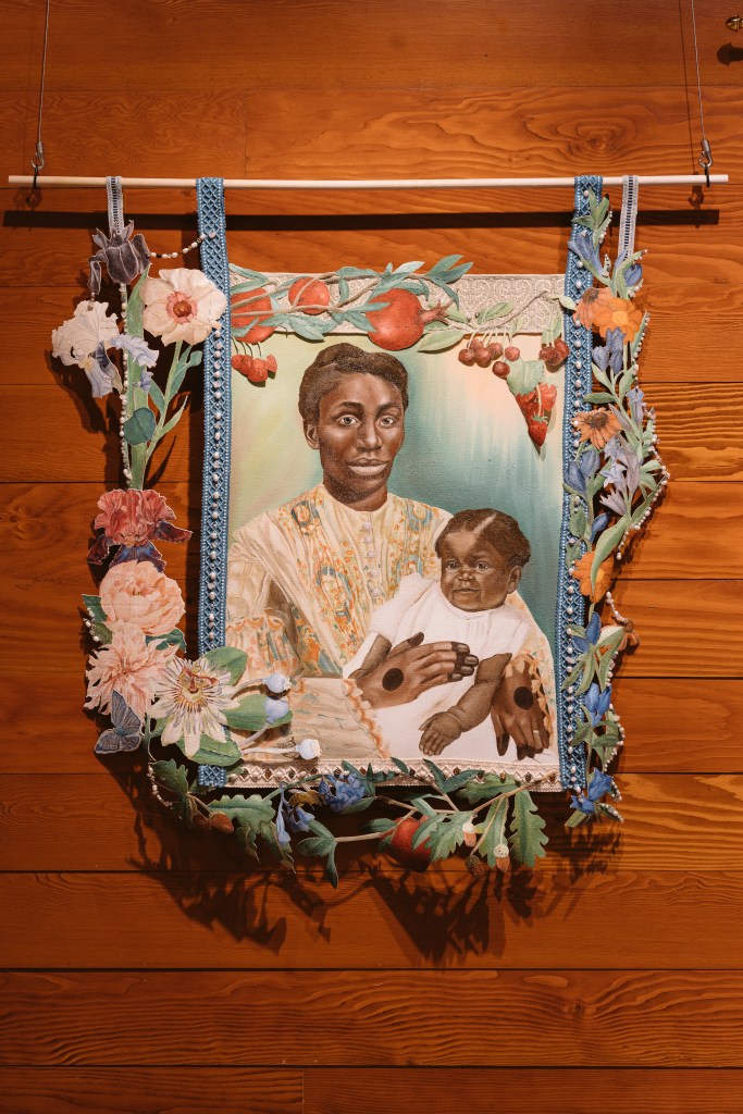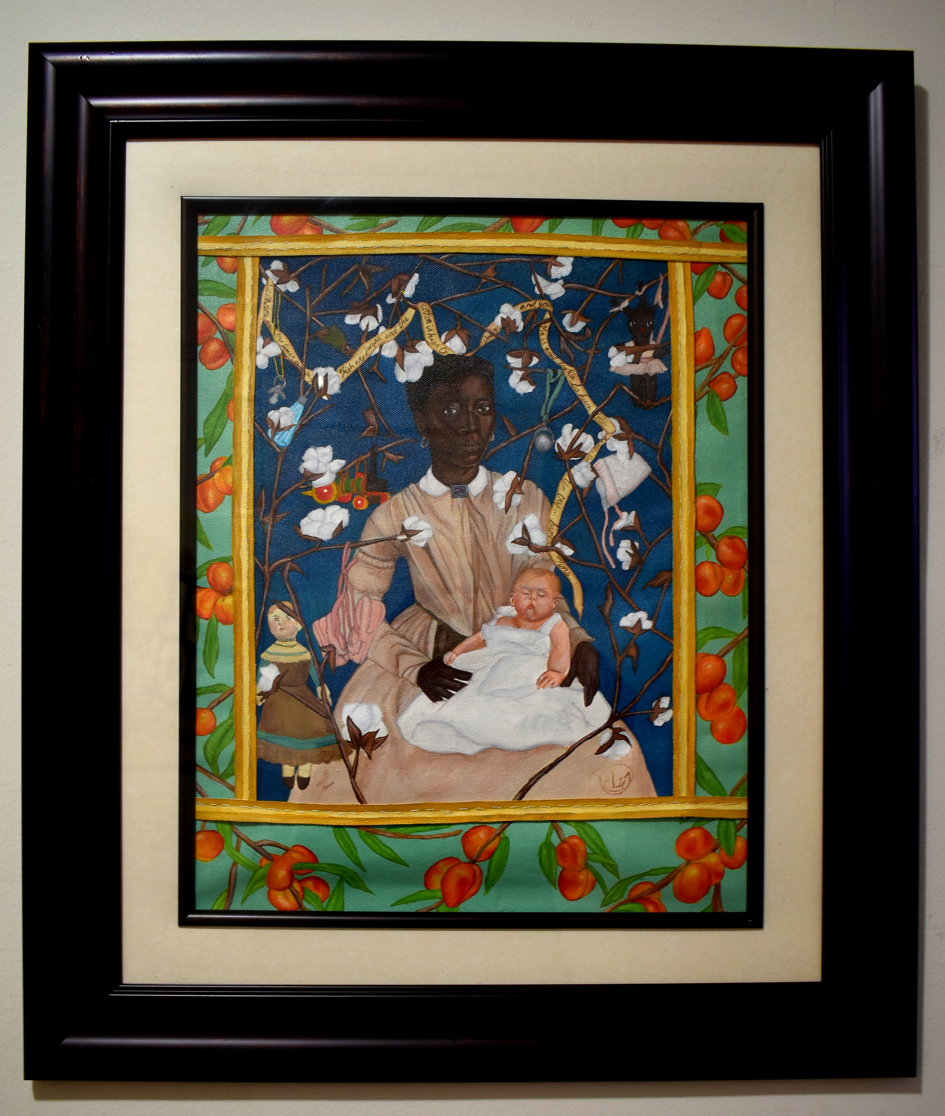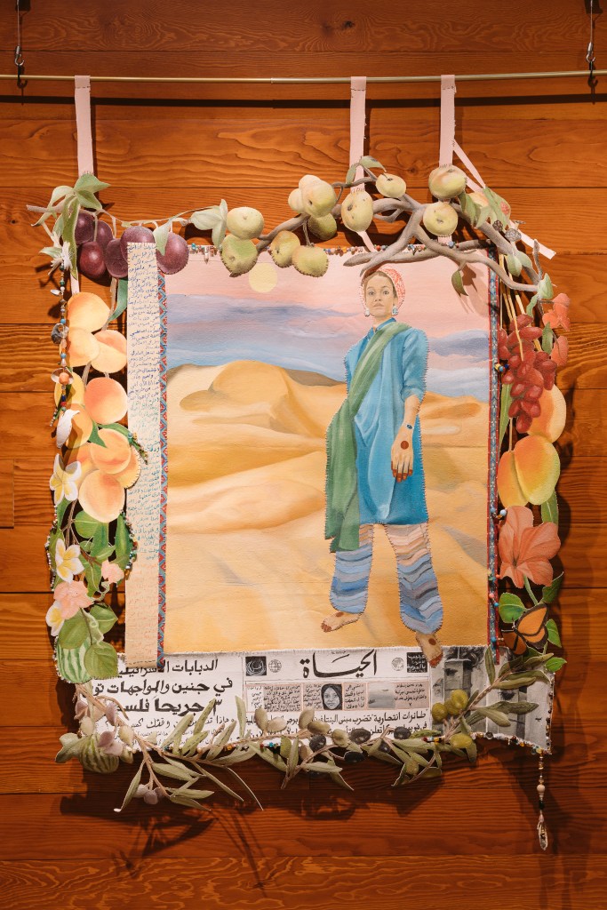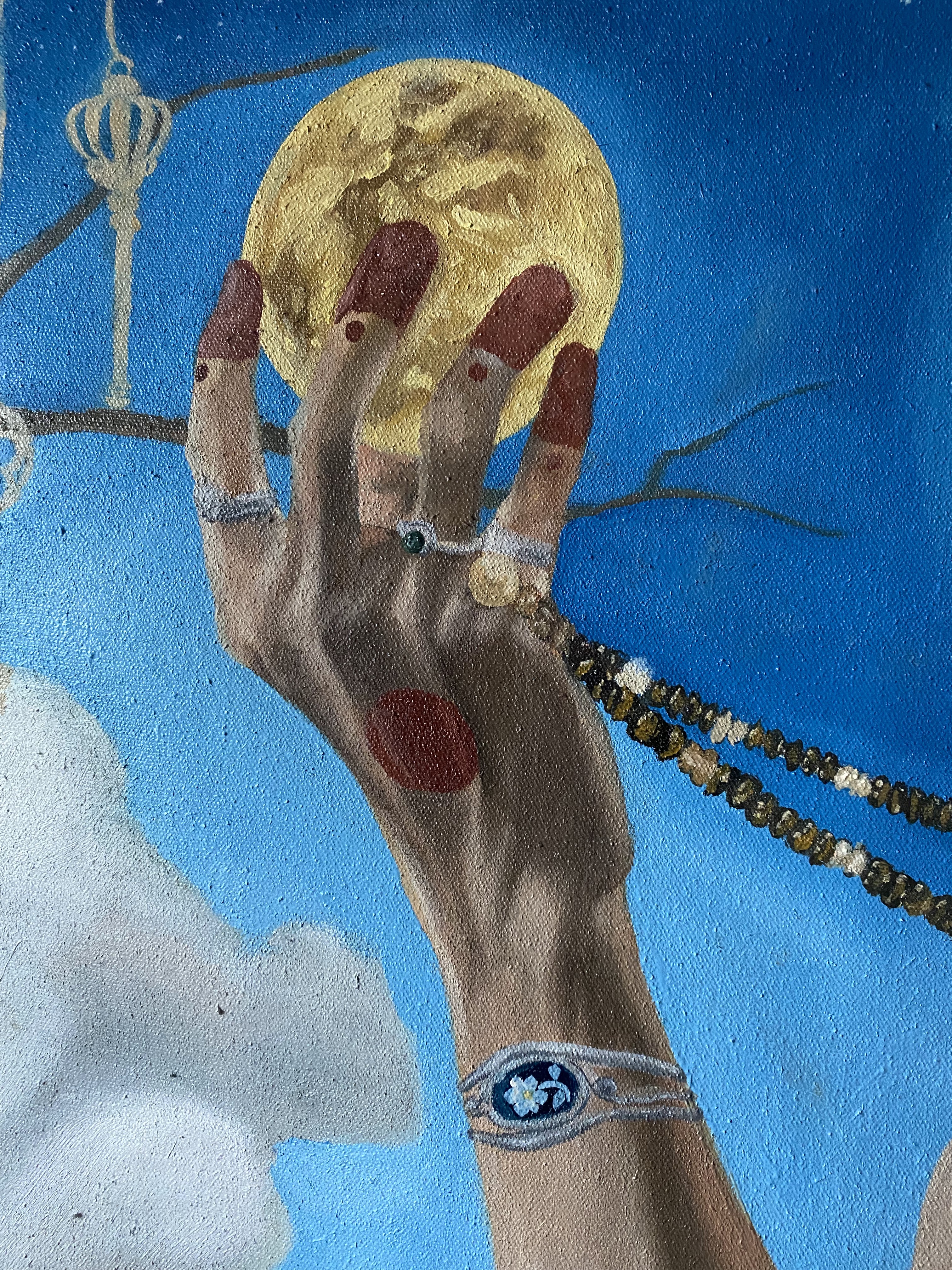 (oil painting on hand cur canvas, and gem stone beads turquoise, lapis, rose quartz, freshwater pearl, carnelian)